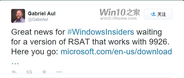 1月29日消息,微软Win10内测项目负责人Gabriel Aul在其Twitter上表示,微软已经发布了Win10远程服务器管理工具(RSAT),现在Win10内测用户就可以进行下载。